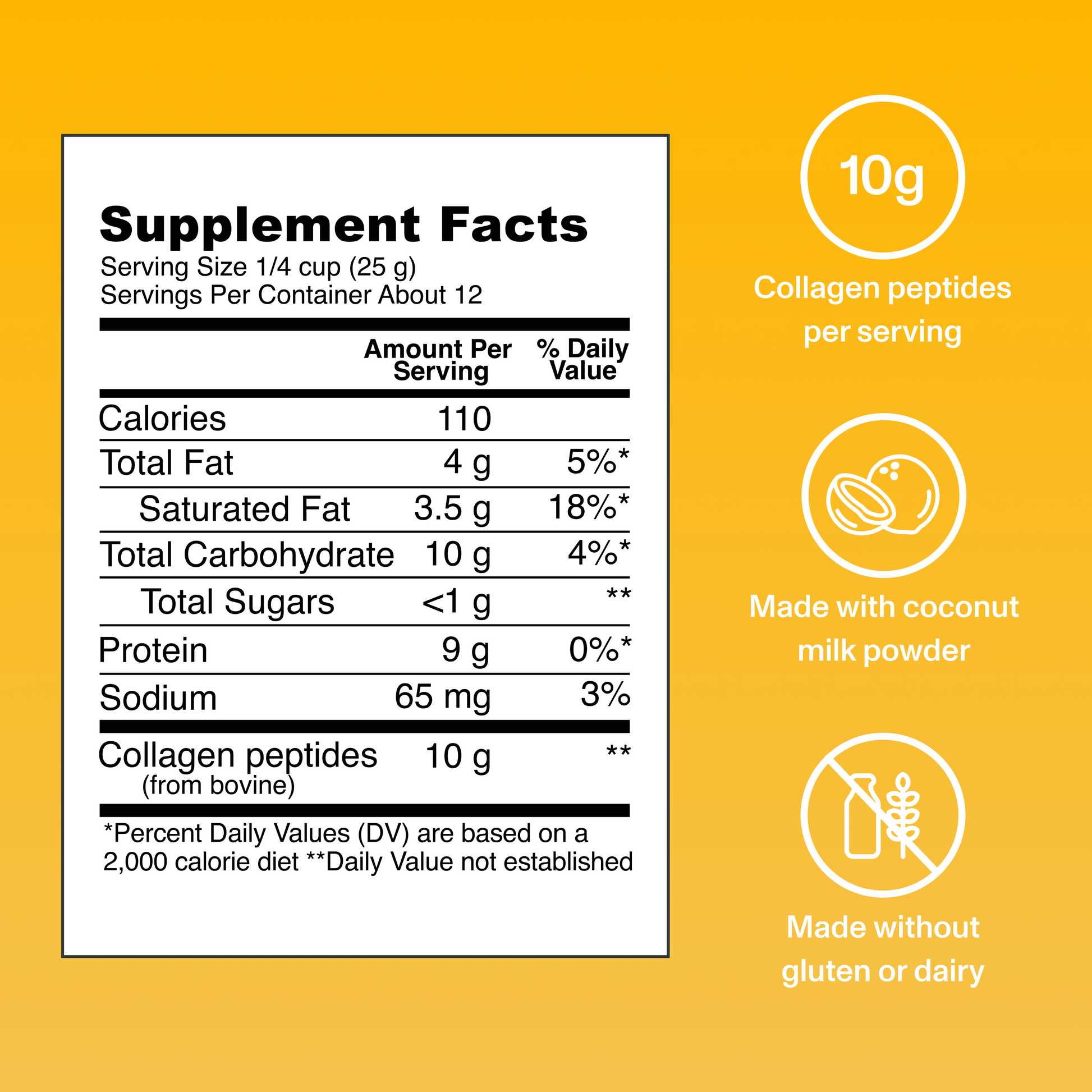 Organic Coconut Milk Powder: Our Vanilla Collagen Creamer™ supplement includes 9g of healthy fats from organic coconut milk powder. FYI: Coconut is an excellent source of Medium Chain Triglycerides (MCTs).