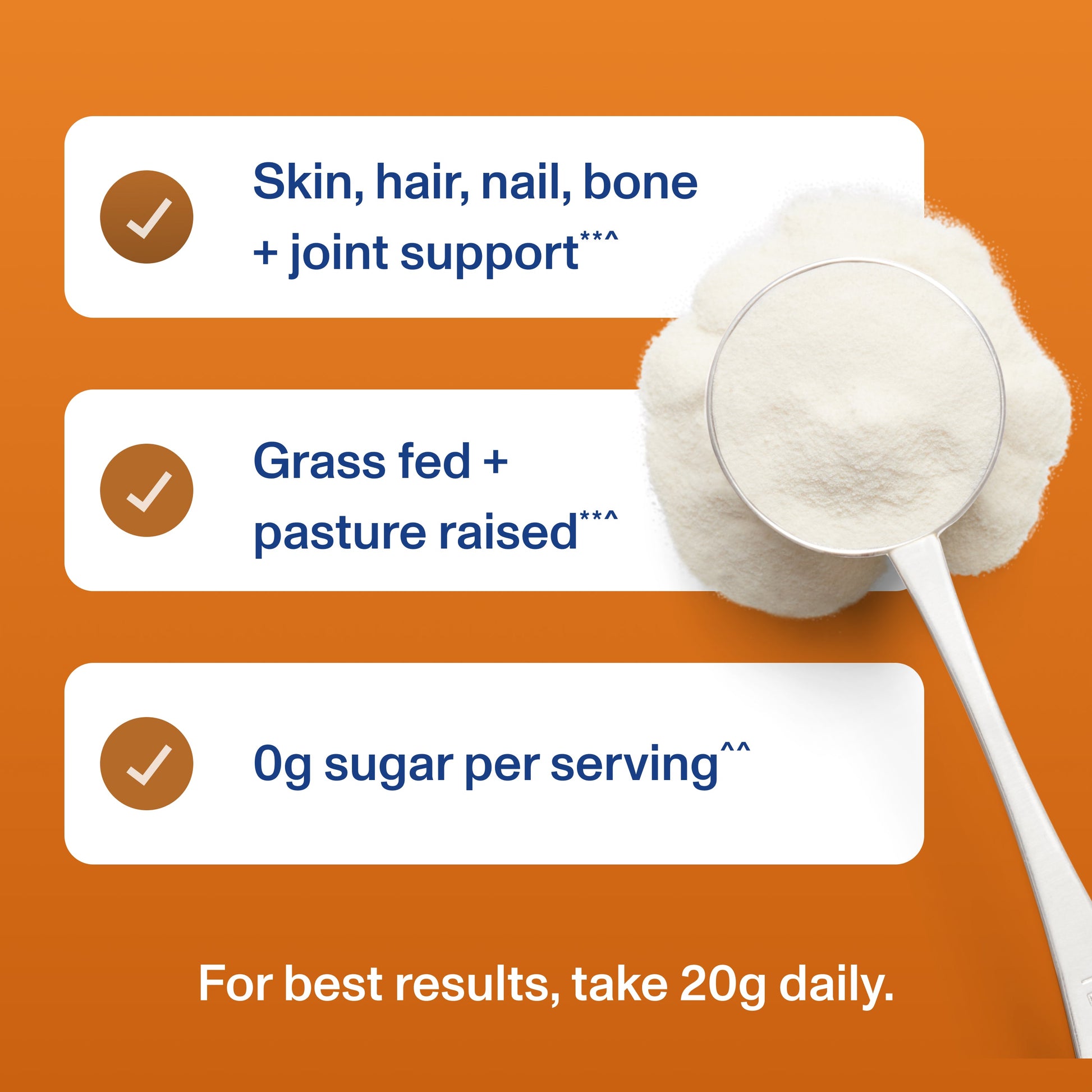 20g of collagen peptides per serving to helps support healthy hair, skin, nails, bones and joints.