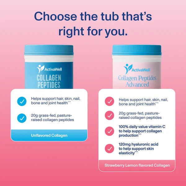 Looking to boost your scoop? Reach for this thrice-as-nice formula. In addition to collagen, which supports healthy hair, nails, skin, bones and joints, our Collagen Peptides Advanced powder boasts hyaluronic acid and vitamin C, powerhouse ingredients that provide glowing wellness benefits now in a NEW fresh flavor Strawberry Lemon.